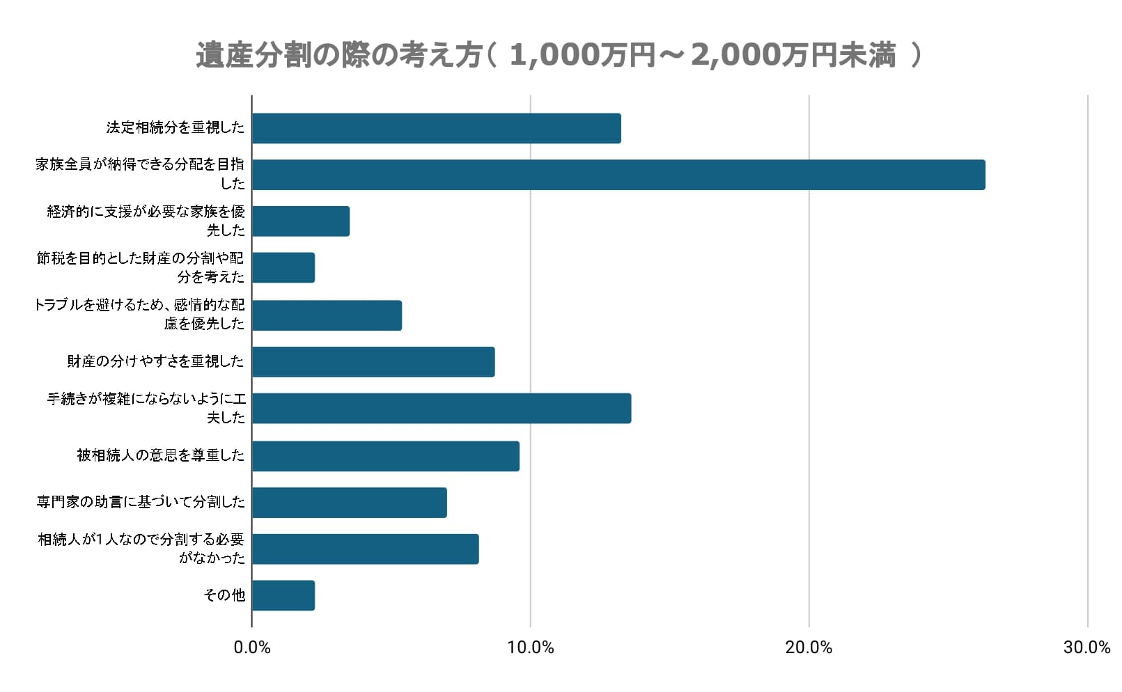 遺産の分け方については、家族全員が納得できる分配を目指した(26.3%)が最も多い回答。相続人間での合意を重視する家庭が多いことが伺えます。次に法定相続分を重視した(13.2%)との回答が続きました。法的なルールに基づいて分割することが一般的な選択肢となっているようです。手続きが複雑にならないように工夫した(13.6%)、財産の分けやすさを重視した(8.7%)という回答が一定の割合を占めました。手間やコストを抑えることが重視されていることがうかがえます。