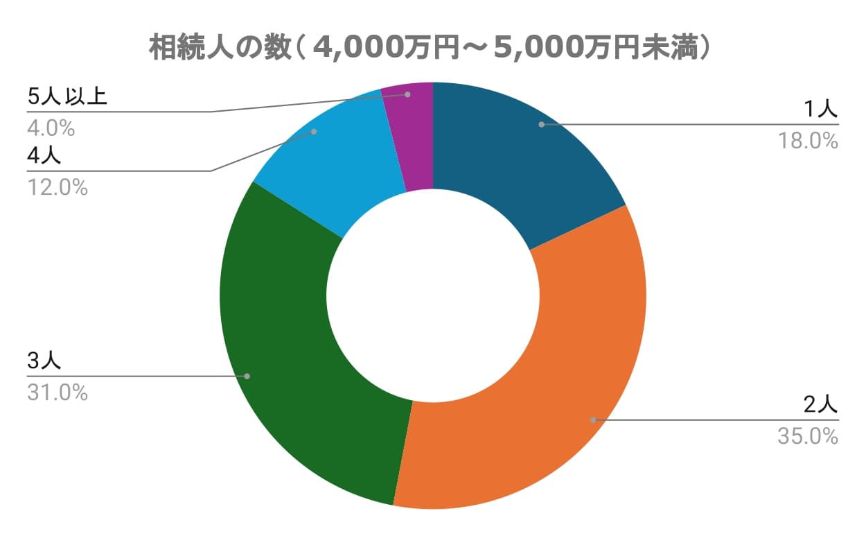 相続財産が4,000万円~5,000万円未満の場合の相続人の数は、2人(35.0%)と3人(31.0%)が全体の約3分の2を占めました。1人の場合も18.0%と一定の割合がありました。