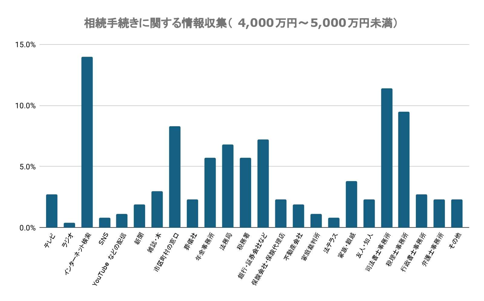 相続財産が4,000万円~5,000万円未満の場合、どのような財産が相続され、どのような手続きが必要になるのでしょうか。また、手続きにかかる期間や、情報収集の方法にはどのような特徴があるのでしょうか。