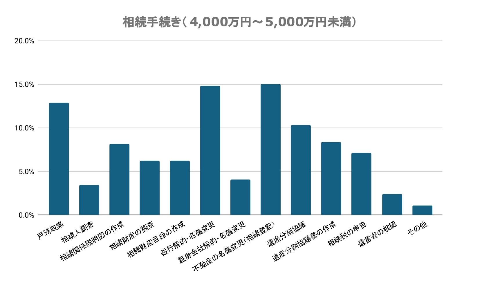 相続財産4,000万円~5,000万円未満の場合の実際の手続きで最も多かったのは不動産の名義変更(15.0%)でした。2番目が銀行解約・名義変更(14.8%)ですが、不動産の名義変更とほぼ同じ割合を占めました。これらは相続財産に関わる手続きとして非常に一般的であり、多くの相続ケースで必要となる手続きです。