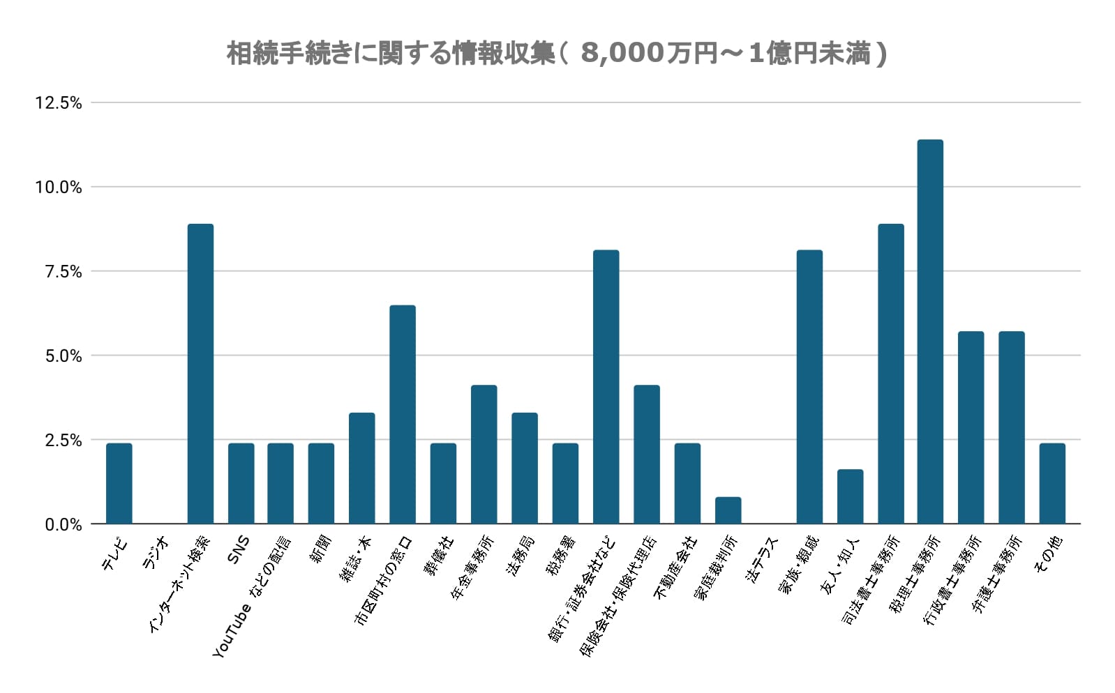 相続財産が8,000万円~1億円未満の場合、どのような財産が相続され、どのような手続きが必要になるのでしょうか。また、手続きにかかる期間や、情報収集の方法にはどのような特徴があるのでしょうか。