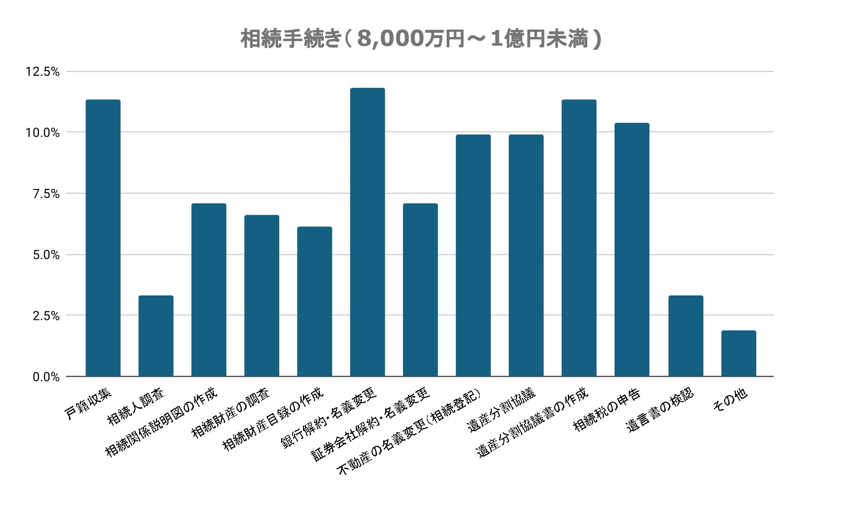 遺産8,000万円~1億円未満の規模では相続税が課されるケースが多いため、相続税の申告(10.4%)も行った手続きとして一定の割合を占めています。