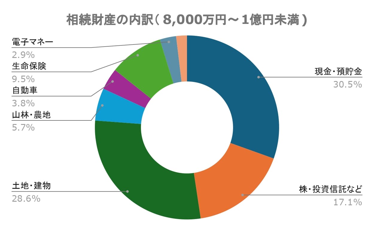 相続財産の総額が8,000万円~1億円未満のの遺産の内訳は現金・預貯金が最も多い30.5%、土地・建物が28.6%、金融資産(株式・投資信託など)が17.1%でした。