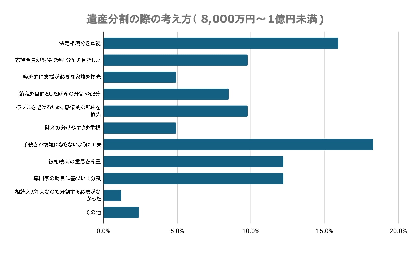 遺産分割の考え方に関する回答では、手続きが複雑にならないように工夫した(18.3%)との回答が最も高い割合を占めました。遺産総額が大きい場合、スムーズな相続手続きが重要視されることが多いようです。次に高い割合だったのが法定相続分を重視(15.9%)との回答でした。財産が多額で複雑な場合、法律に基づいた分割で公平性を保ち、トラブルを避ける意図があると考えられます。3番目には被相続人の意思を尊重した(12.2%)との回答が続きました。被相続人の遺言や意思を尊重した分配を心がけることで、相続人同士の感情的な対立を避けた可能性があります。
