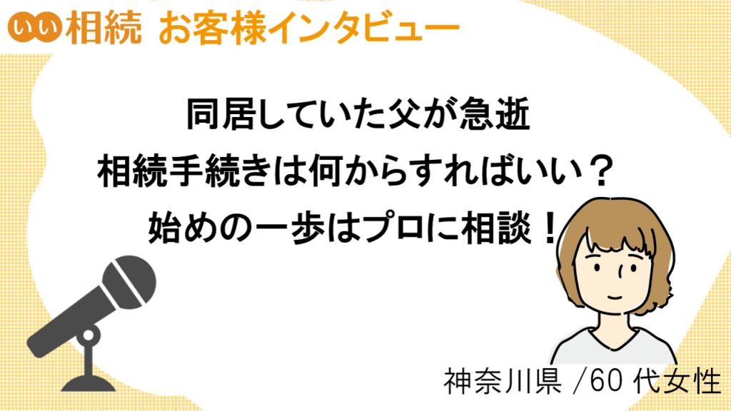 お父様を亡くされ、相続手続きは何から手を付ければいいのか分からず困っていたというご相談者様(神奈川県/60代女性)
