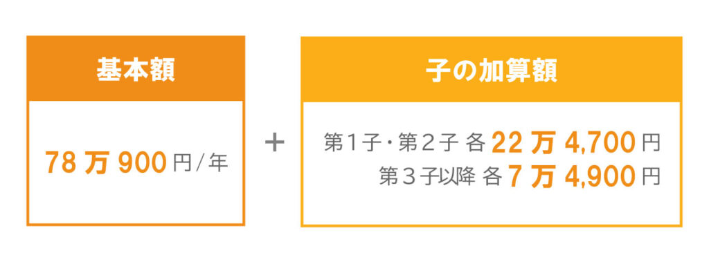 子のある配偶者が受け取る遺族基礎年金の年額は、「78万900円+子の加算額」となります。 子の加算額は、第一子・第二子が1人につき22万4,700円、3人目以降が1人につき7万4,900円です。