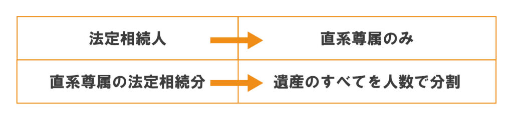 したがって「ご相談内容」では、直系尊属のみが法定相続人の場合にあたりますので、法定相続人はお父様・お母様のみであり、ご次男は法定相続人ではありません。また、直系尊属の法定相続分の合計は遺産のすべてですから、お父様・お母様のお2人で均等分します(父1/2、母1/2、弟0)。