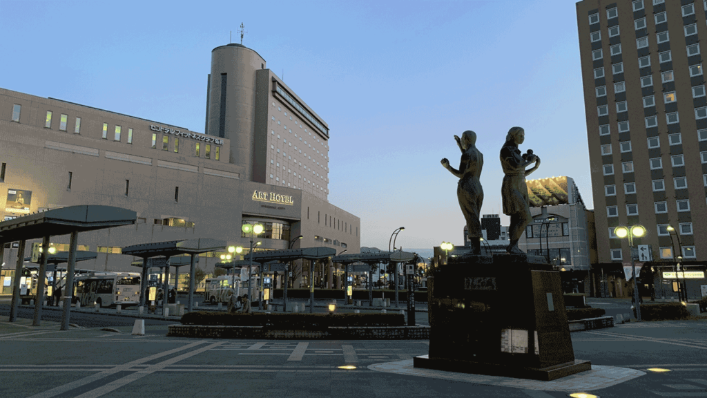 弘前駅は、青森県弘前市にあり、JR東日本、JR貨物、弘南鉄道の停車駅です。駅前にはりんごの街をイメージした立像があり、街中のマンホールの蓋にもりんごが描かれているなど、観光客へりんごの街弘前へ訪れたことのの強い印象付ける目的から様々な工夫がなされています。