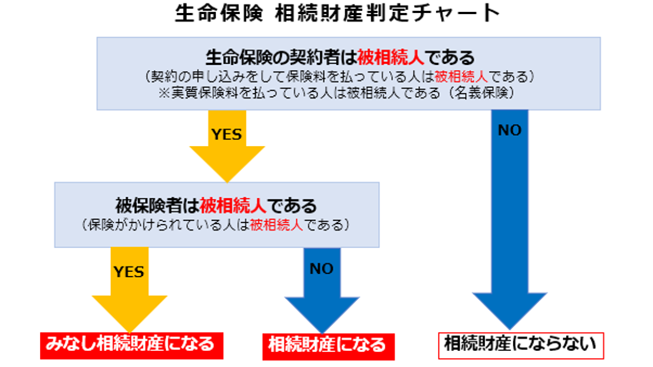 生命保険は少し複雑です。被保険者、保険料の負担者および保険金受取人がそれぞれ誰なのかにより相続財産やみなし相続財産になる場合、相続財産にならない場合があります。契約者・被保険者・死亡保険金の受取人が誰なのかにより財産の種類や税金の種類が変わることに注意が必要です。
