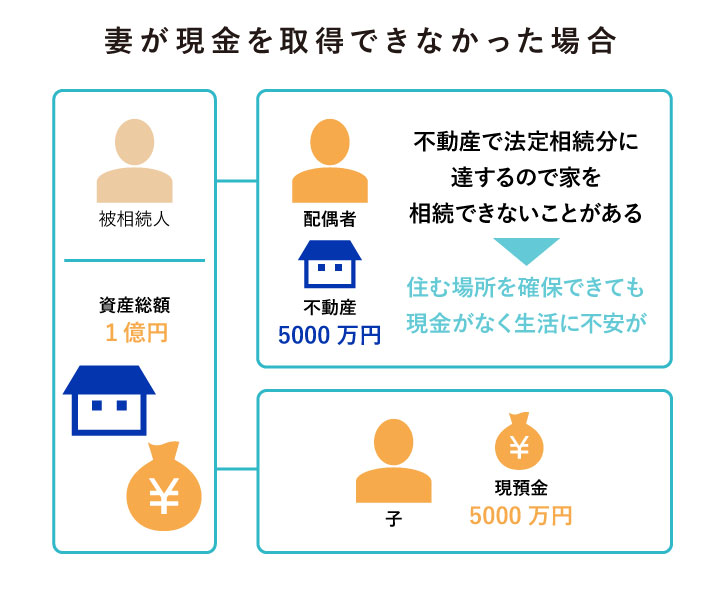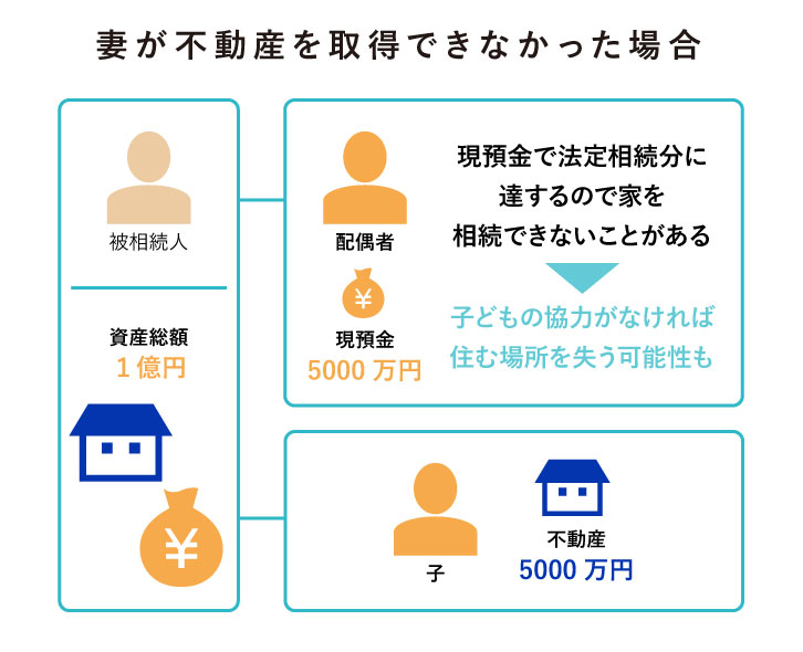 法定相続分に沿って長男が自宅不動産(5,000万円)を取得し、妻が預貯金(5,000万円)を取得した場合、妻は現金は手に入りますが住まいを失ってしまう可能性があります。