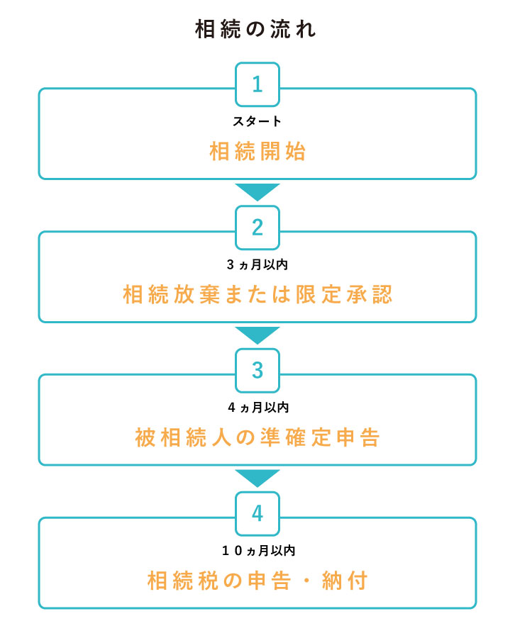 相続税の申告までの流れを大まかに示したものが上の図です。相続放棄をする場合や限定承認する場合には、相続開始後3ヵ月以内に、その旨を決め家庭裁判所に申述し手続きをする必要があります。そのためには早い段階で故人の相続財産を把握し、相続人を確定、遺言書の有無を確認し、必要であれば遺産分割協議書を用意しなければなりません。