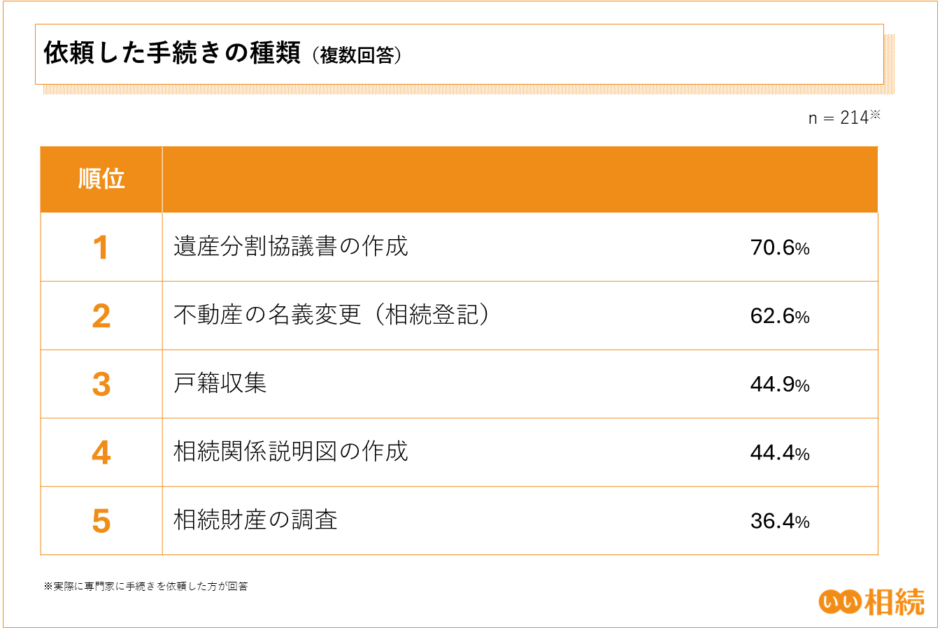 実際に専門家に相続手続きを依頼した方に、依頼した手続きの種類を尋ねたところ、最も多かったのは「遺産分割協議書の作成」で70.6%にのぼりました。次いで、「不動産の名義変更(相続登記)」が62.6%、「戸籍収集」が44.9%と続きます。