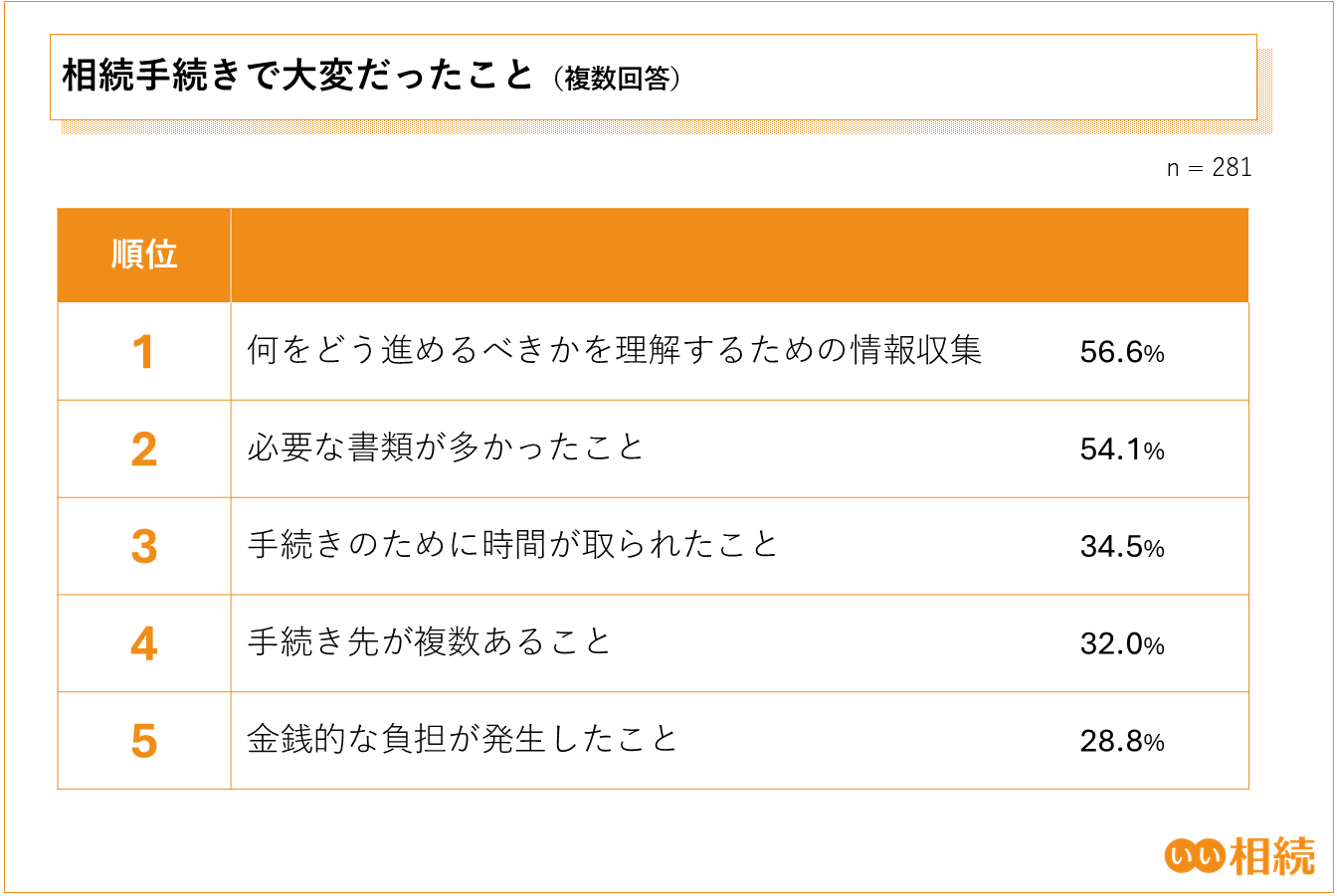 「相続手続きで大変だったことは何か」という質問に対して、最も多かった回答は「何をどう進めるべきかを理解するための情報収集」で56.6%を占めました。次いで、「必要な書類が多かったこと」が54.1%、「手続きのために時間が取られたこと」が34.5%となっています。