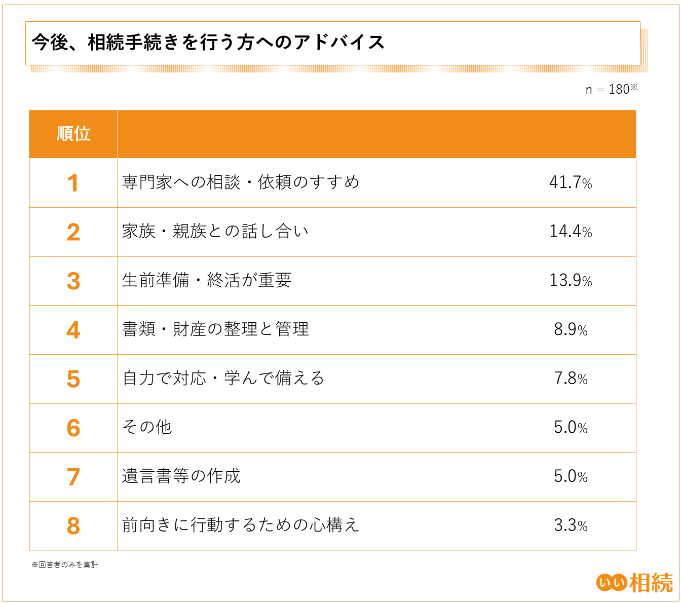 また、「自身の体験を踏まえて、今後相続手続きを行う方に向けたアドバイスをお願いします」という設問に対しては、多くの方から自由記述による回答をいただきました。