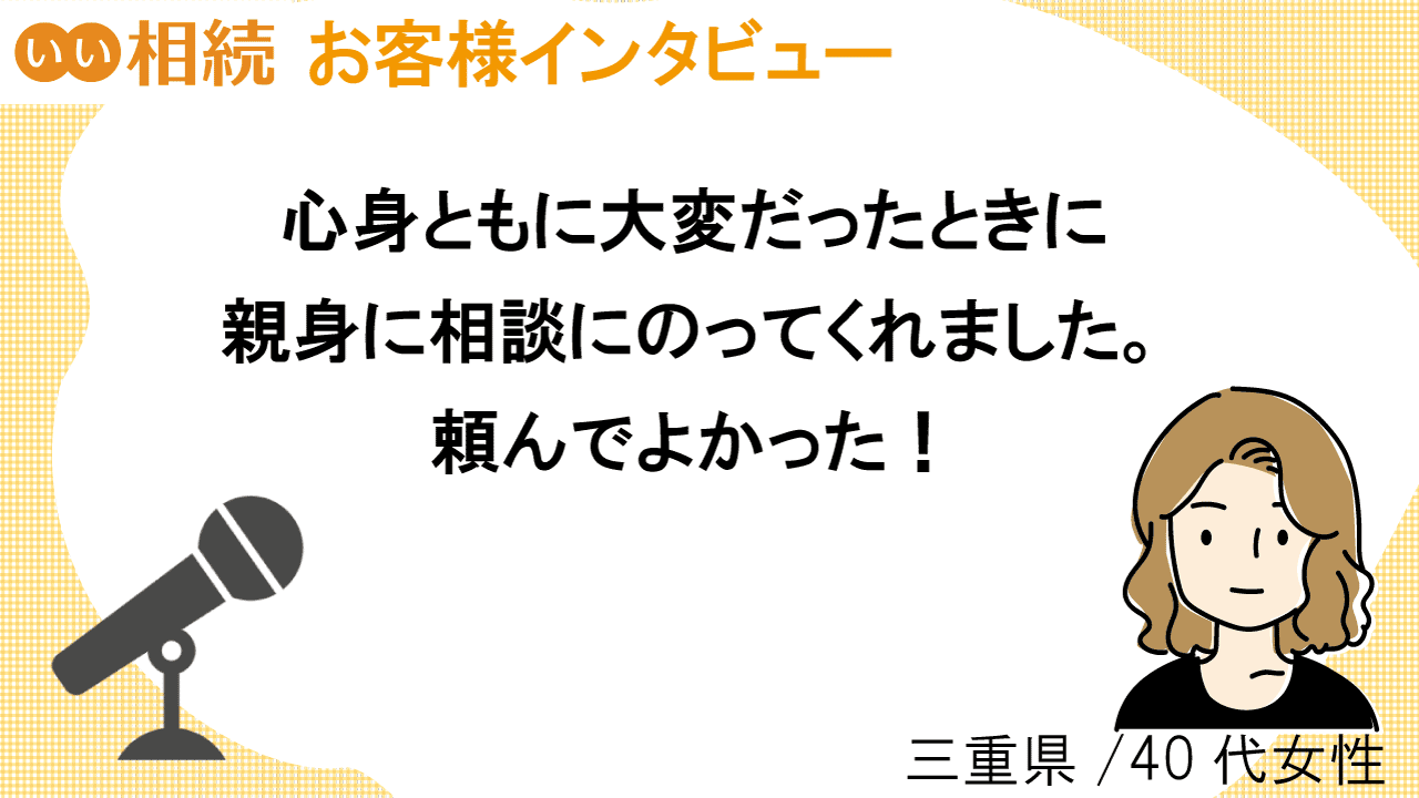 「いい相続(姉妹サイト:e行政書士、e税理士等を含む)」をご利用いただいた方へのリアルなお客様の声です。「いい相続」にご相談をいただいたきっかけや、利用した感想、どのように相続のお悩みを解決したのかをいい相続のスタッフがインタビューしました。