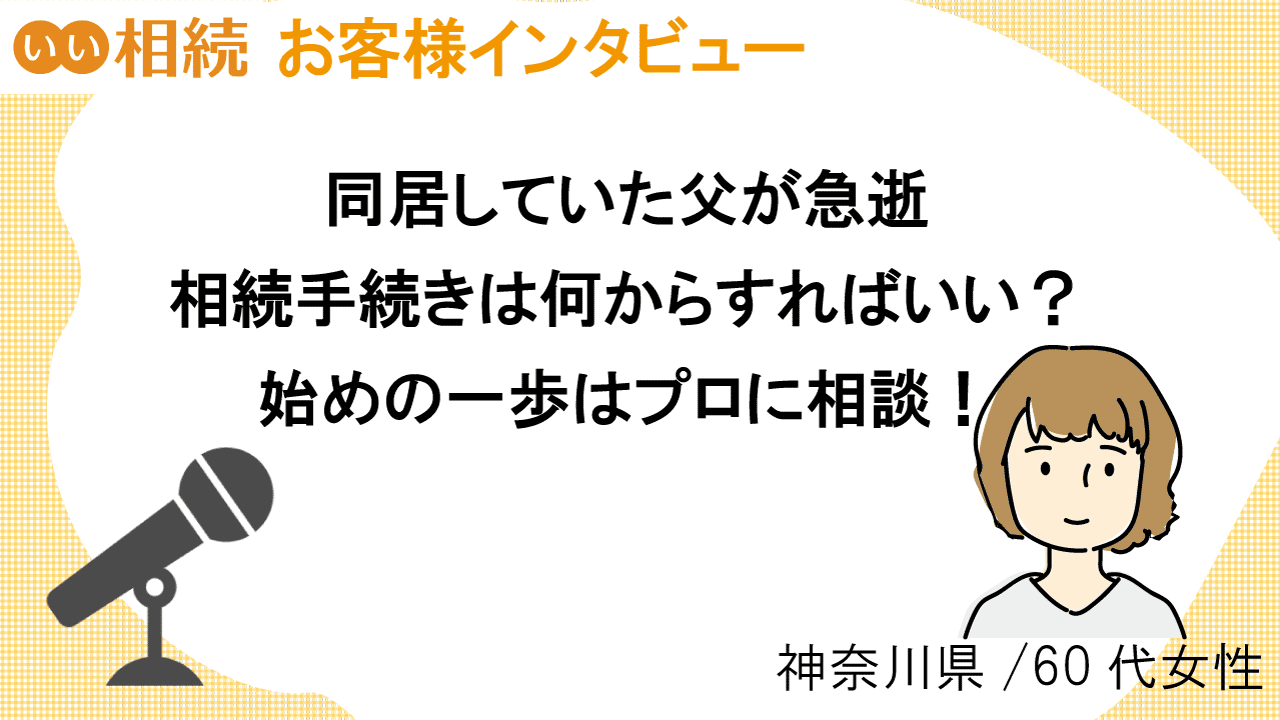 「いい相続(姉妹サイト:e行政書士、e税理士等を含む)」をご利用いただいた方へのインタビュー。 お父様を亡くされ、相続手続きは何から手を付ければいいのか分からず困っていたというご相談者様(神奈川県/60代女性) どのようにお悩みを解決したのかお話しいただきました。 「いい相続」を見つけたのはヤフー検索 私は昨年から父と同居をしていました。父は認知症で……