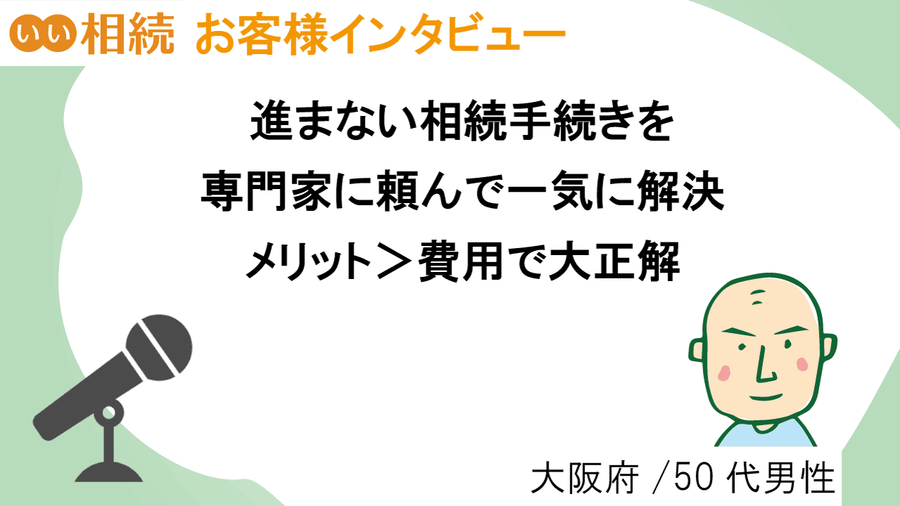 「いい相続(姉妹サイト:e行政書士、e税理士等を含む)」をご利用いただいた方へのインタビュー。 お父様が亡くなり、相続税申告の準備をされているご相談者様(大阪府/50代男性) どのようなお困りごとがあったのかをお話しいただきました。 相談のきっかけ ──今回、ご相談いただくことになった経緯について教えていただけますか。 はい。昨年、父が85歳で亡く……