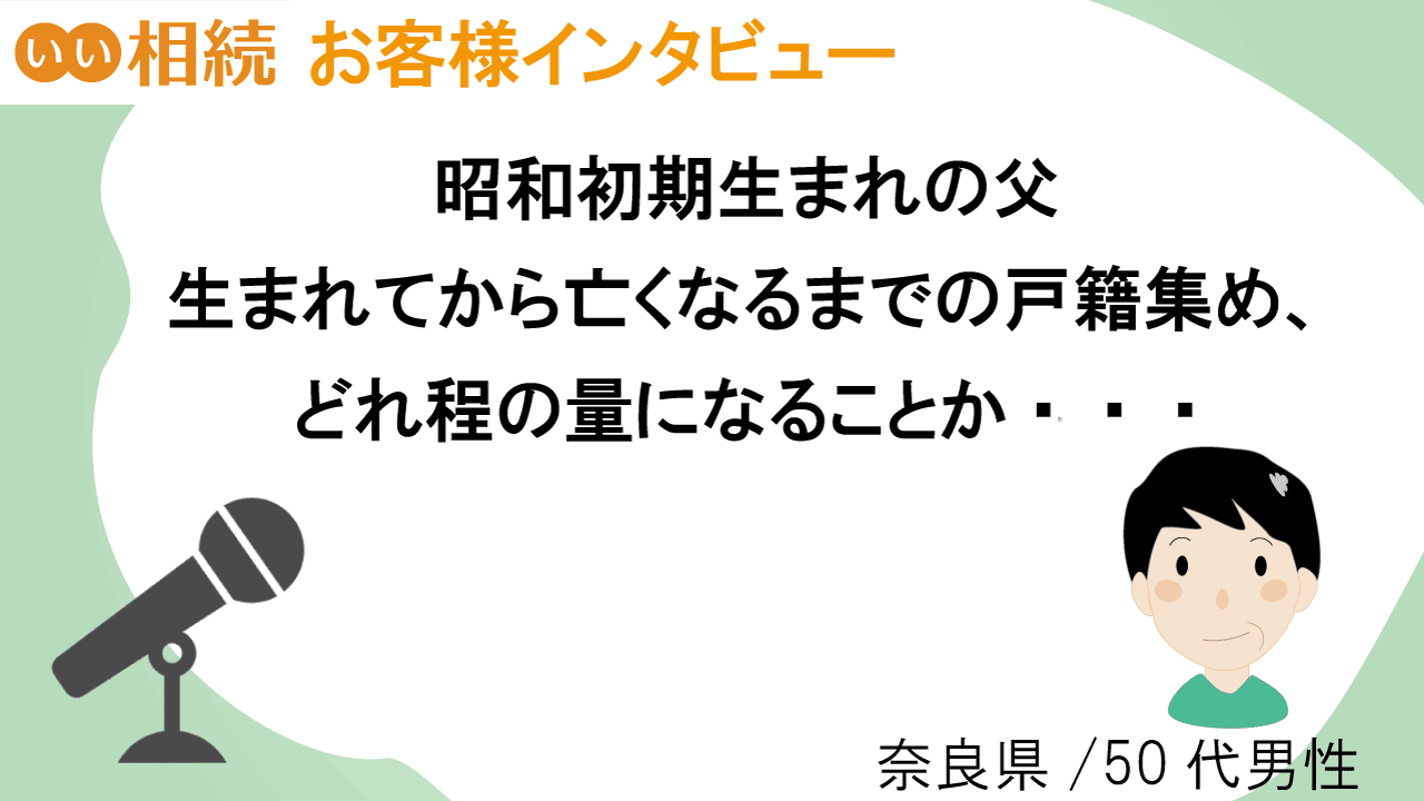 「いい相続(姉妹サイト:e行政書士、e税理士等を含む)」をご利用いただいた方へのインタビュー。 お父様が亡くなり、相続手続きを依頼されたご相談者様(神奈川県/50代男性) どのようなお困りごとがあったのかをお話しいただきました。 先に亡くなった母親の相続は手付かずだった ── どなたの相続でご相談いただいたのでしょうか? 父親が亡くなったのでその相……