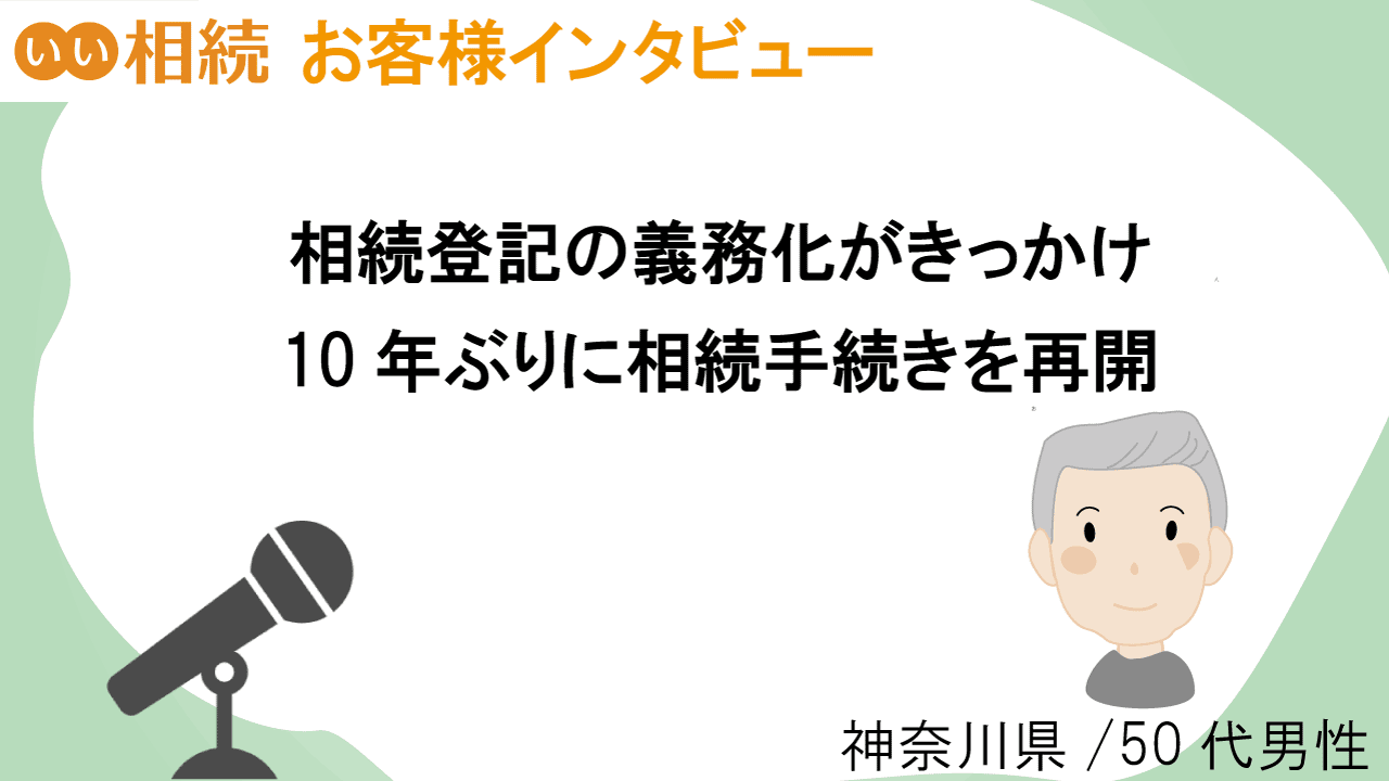 「いい相続(姉妹サイト:e行政書士、e税理士等を含む)」をご利用いただいた方へのインタビュー。 10年前の相続手続きを再開したご相談者様(静岡県/60代男性)。 どのようなお困りごとがあったのかをお話しいただきました。 10年越しの決断の理由は「相続登記の義務化」 ──今回はご協力ありがとうございます。まず、いい相続にご相談いただくことになった経緯に……