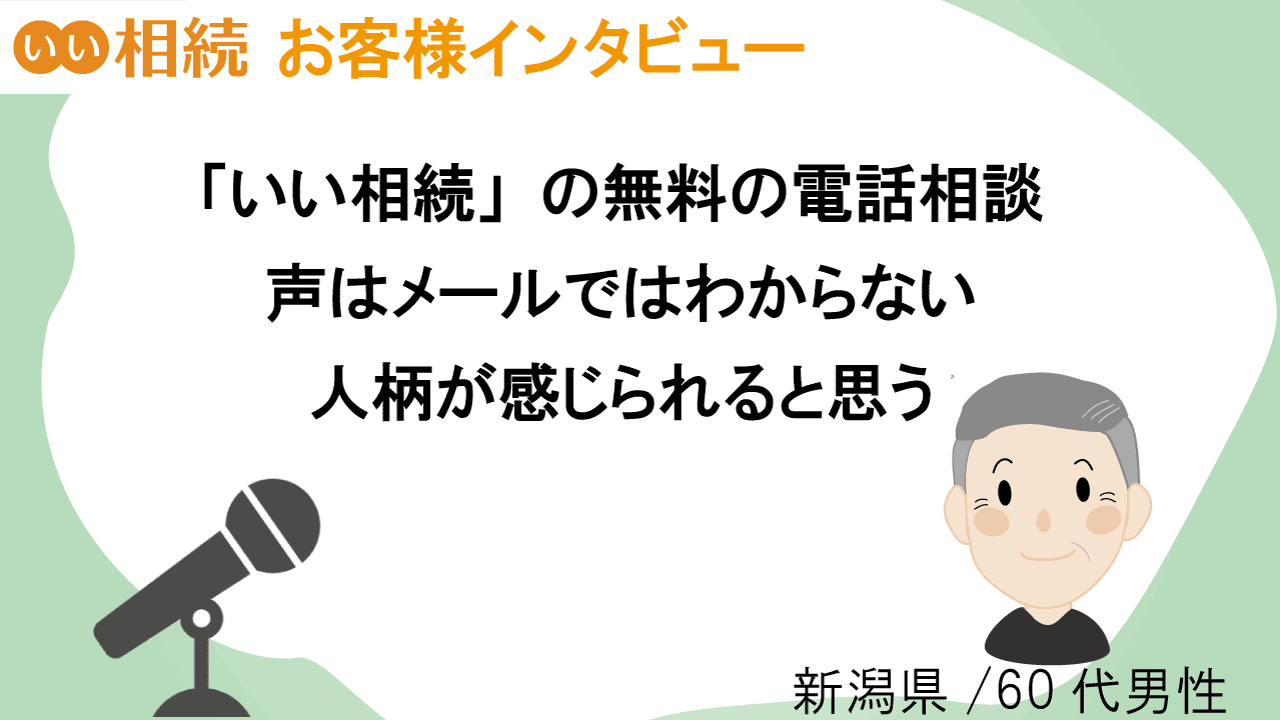 「いい相続(姉妹サイト:e行政書士、e税理士等を含む)」をご利用いただいた方へのリアルなお客様の声です。「いい相続」にご相談をいただいたきっかけや、利用した感想、どのように相続のお悩みを解決したのかをいい相続のスタッフがインタビューしました。