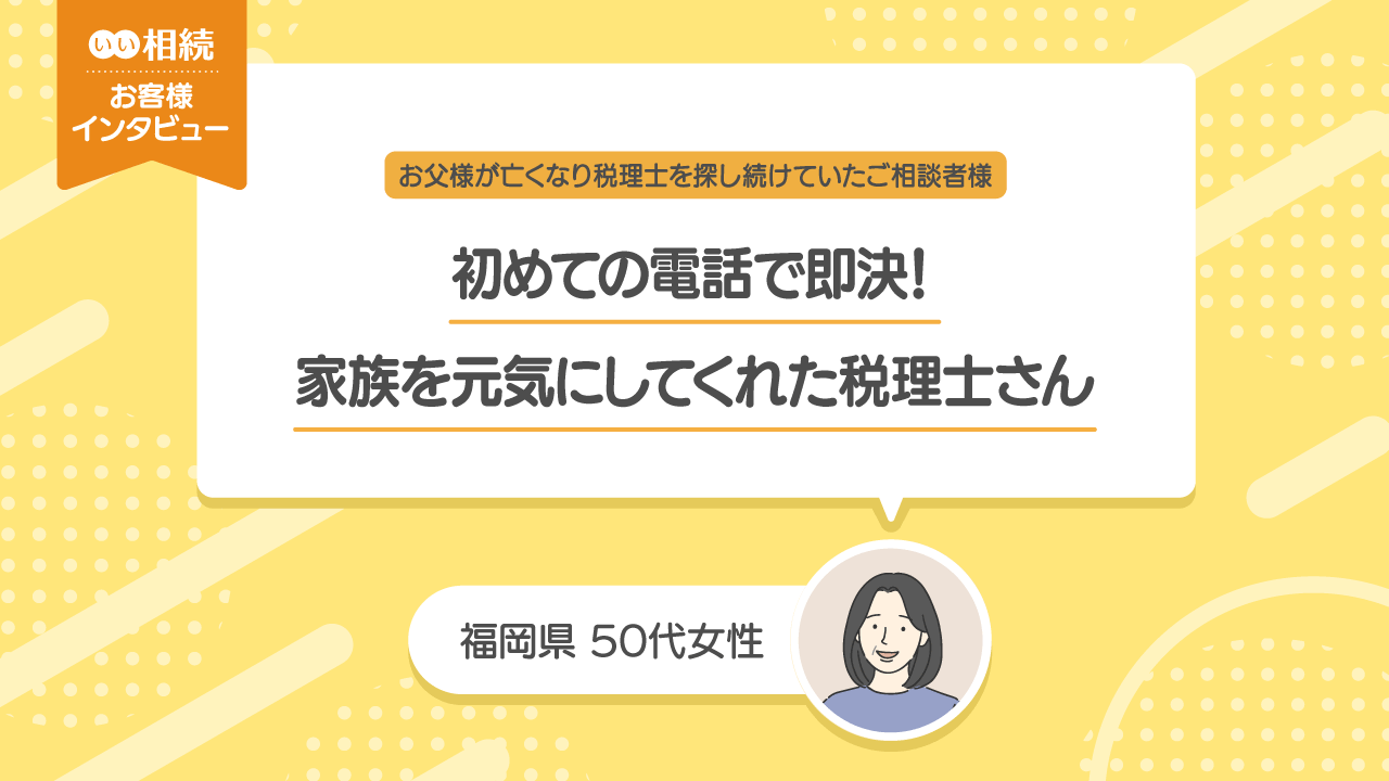 「いい相続(姉妹サイト:e行政書士、e税理士等を含む)」をご利用いただいた方へのインタビュー。 お父様が亡くなり税理士を探し続けていたご相談者様(福岡県/50代女性) 「いい相続」でどのように解決されたのかをお話しいただきました。 相続税申告を頼みたいけど、見積りが高くて困った 昨年父が亡くなり、遺産をまとめていると相続税がかかりそうだと分かりました……