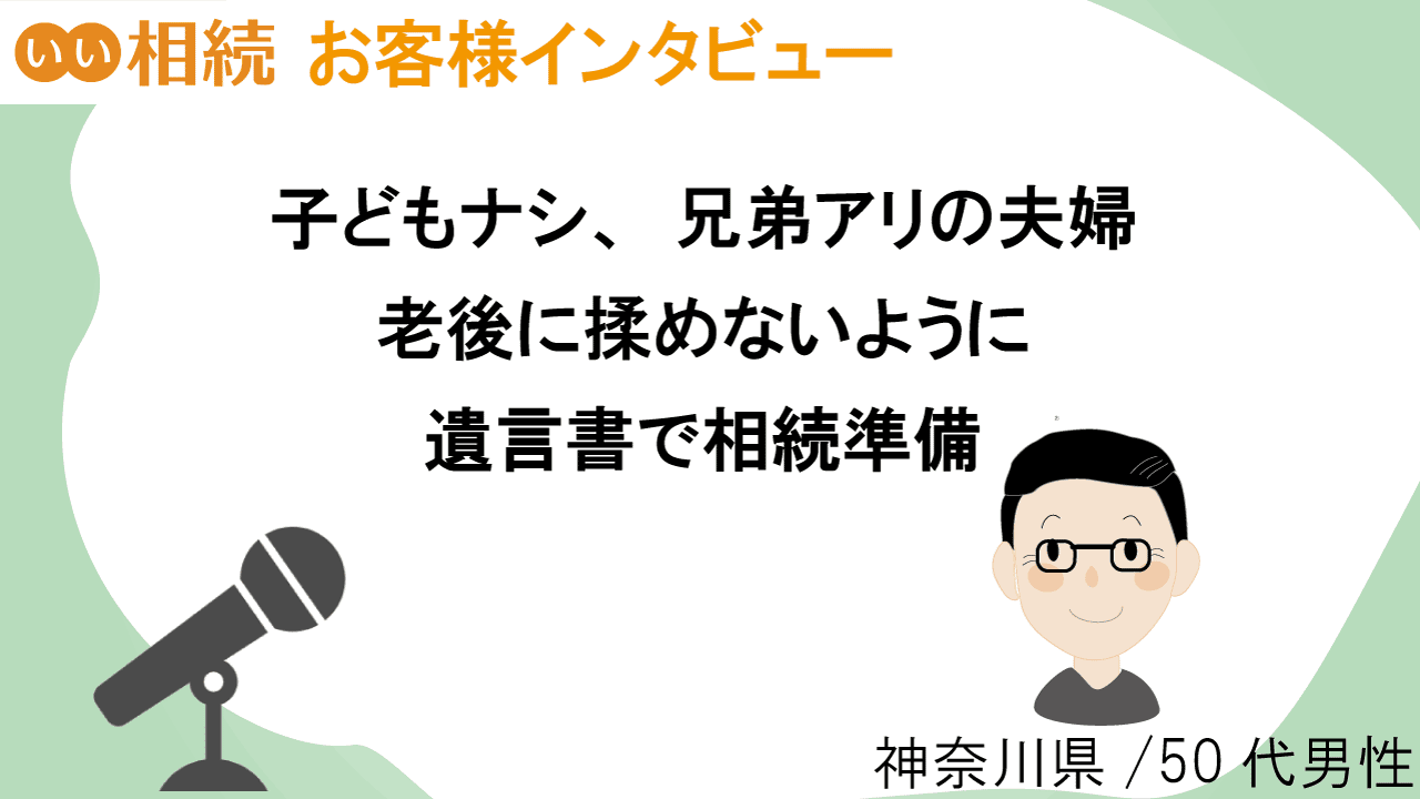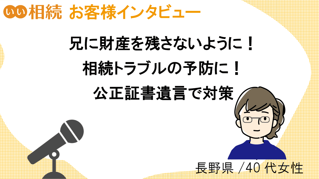 「いい相続(姉妹サイト:e行政書士、e税理士等を含む)」をご利用いただいた方へのインタビュー。 夫婦で公正証書遺言書を作ったご相談者様(長野県/40代女性)。 どのような相続のお悩みがあったのかお話しいただきました。 兄弟仲が悪く、遺産を渡したくなかった ──いい相続にご連絡をいただいたのはどのような理由だったのでしょうか。 私たち夫婦は子どもがい……