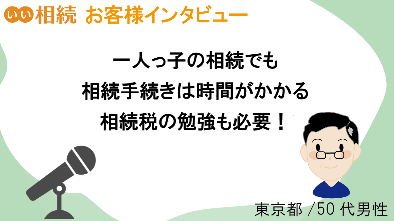 「いい相続(姉妹サイト:e行政書士、e税理士等を含む)」をご利用いただいた方へのインタビュー。 相続税申告を依頼されたご相談者様(東京都/50代男性) 相続のお悩みを「いい相続」でどのように解決されたのかをお話しいただきました。 代襲相続で相続人はいとこだけ ──相続についてどのようなお悩みがあったのでしょうか。 父が昨年の春先に誤嚥性肺炎をおこし……