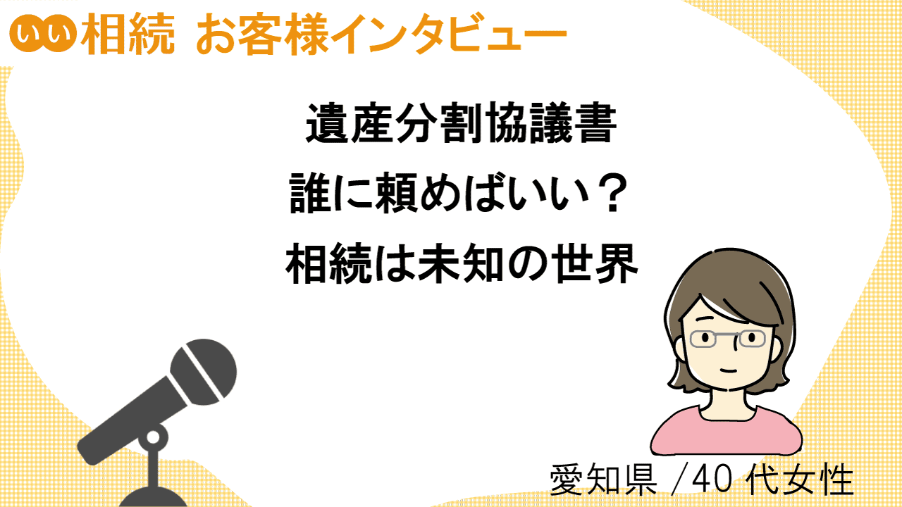 「いい相続(姉妹サイト:e行政書士、e税理士等を含む)」をご利用いただいた方へのリアルなお客様の声です。「いい相続」にご相談をいただいたきっかけや、利用した感想、どのように相続のお悩みを解決したのかをいい相続のスタッフがインタビューしました。