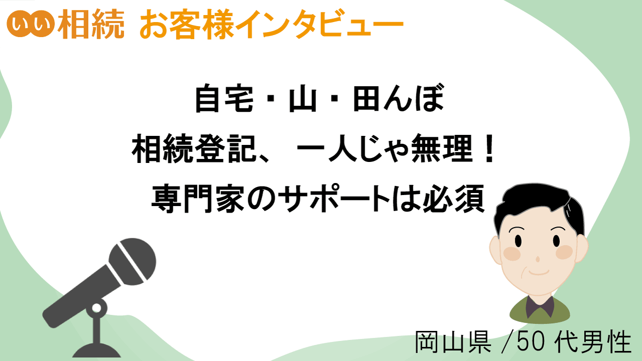 「いい相続(姉妹サイト:e行政書士、e税理士等を含む)」をご利用いただいた方へのインタビュー。 お父様が亡くなって相続登記をしたいというご相談者様(岡山県/50代男性) どのようなお悩みがあって「いい相続」にご相談いただいたのかをお話しいただきました。 長男が不動産を継ぐのは暗黙の了解があった ──相続についてどのようなお悩みがあったのでしょうか。 ……