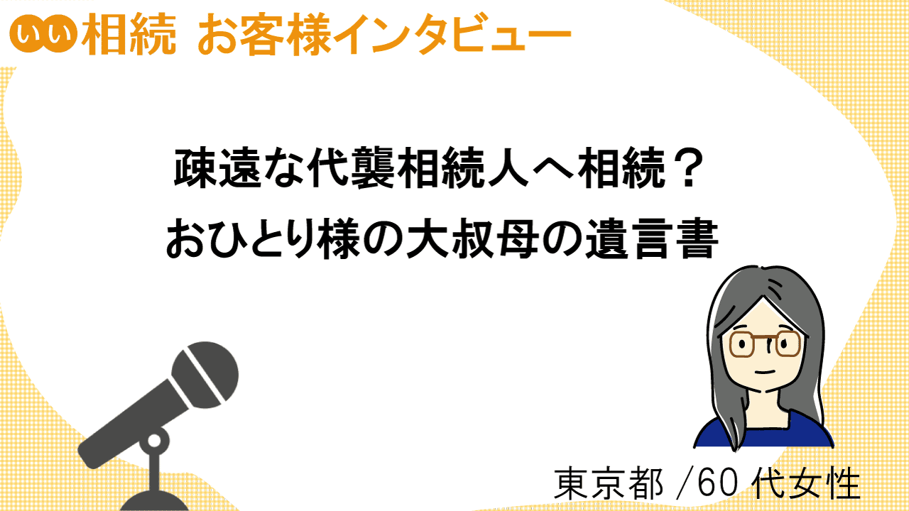 「いい相続(姉妹サイト:e行政書士、e税理士等を含む)」をご利用いただいた方へのインタビュー。 公正証書遺言書を作ったご相談者様(東京都/60代女性)。 どのような相続のお悩みがあったのかお話しいただきました。 大叔母と母と私の関係 私の大叔母が遺言を作りたいというのでご相談しました。 大叔母は、私の祖母と年の離れた姉妹です。私の母にとっては叔母に……