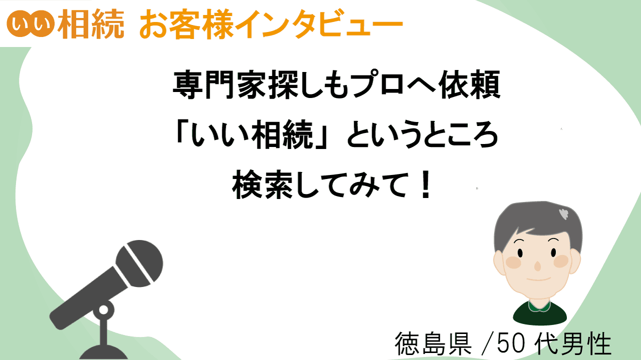 「いい相続(姉妹サイト:e行政書士、e税理士等を含む)」をご利用いただいた方へのインタビュー。 相続手続きを頼める専門家をお探しだった相談者様(徳島県/50代男性)。 どのような相続のお悩みがあったのかお話しいただきました。 財産調査から開始、一人では手に負えないと早々に判断 ──いい相続にご連絡をいただいたのはどのような理由だったのでしょうか。 ……