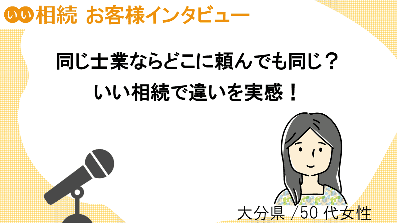 「いい相続(姉妹サイト:e行政書士、e税理士等を含む)」をご利用いただいた方へのインタビュー。 お父様が亡くなって数十年が経っていたけれど、相続手続きに不安が残っていたご相談者様(大分県/50代女性) 相続手続きでどのようなお悩みがあって「いい相続」にご相談いただいたのかをお話しいただきました。 母が終活を意識しはじめ、不動産の名義が不安になった ─……