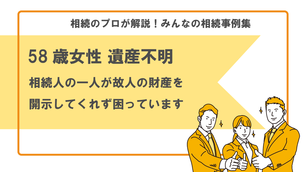 「いい相続」や提携する専門家に寄せられた相続相談をもとに、その解決策を専門家が解説するケーススタディ集「相続のプロが解説!みんなの相続事例集」シリーズ。 今回は、相続人の一人が故人の財産を開示してくれないという、58歳女性の方からの相談事例をご紹介します。 解説は、ヴェルニー行政書士事務所の行政書士・大友 康生さんです。 この記事を書……